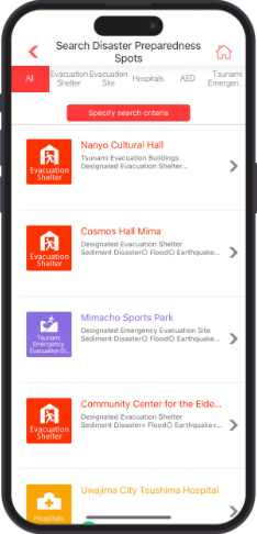 You can switch tabs and search for disaster prevention spots in Uwajima City, divided into the following genres: "Evacuation Shelters," "Evacuation Sites," "Hospitals," "AED," "Tsunami Emergency Evacuation Sites," and "Tsunami Evacuation Buildings."